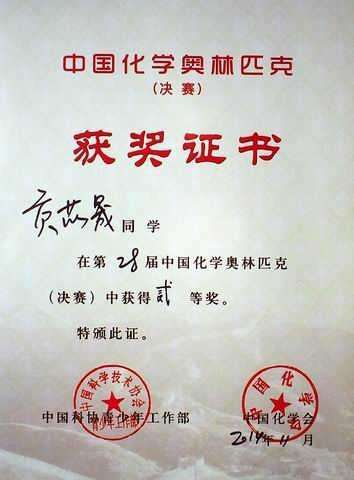 贡苡晟---获第28届中国化学奥林匹克(决赛)二等奖