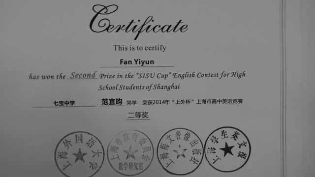 2014.12范宜昀----获2014年“上外杯”上海市高中英语竞赛二等奖(证书)