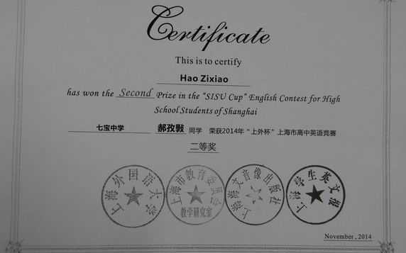 2014.12郝孜斅----获2014年“上外杯”上海市高中英语竞赛二等奖(证书)