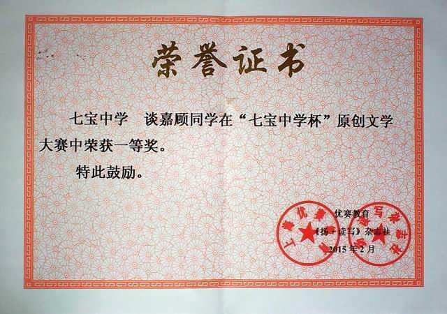 2015.02谈嘉顾----获“七宝中学杯”原创文学大赛一等奖(证书)