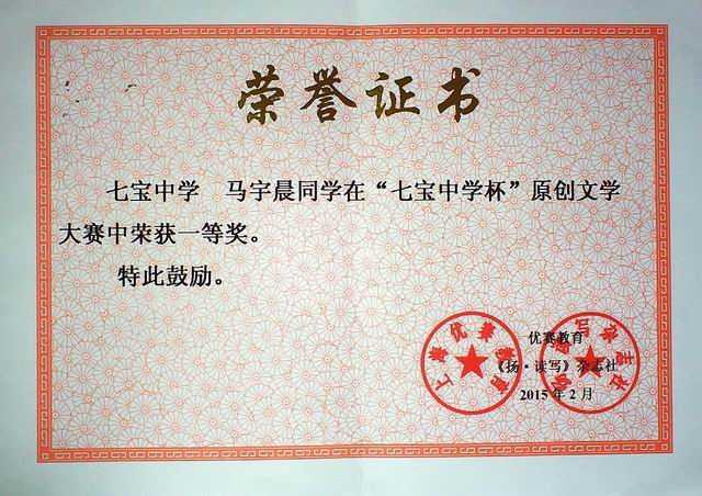 2015.02马宇晨----获“七宝中学杯”原创文学大赛一等奖(证书)