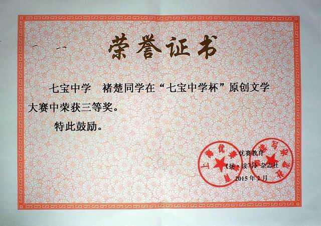 2015.02 褚楚----获“七宝中学杯”原创文学大赛三等奖(证书)