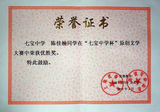 2015.02 陈佳楠----获“七宝中学杯”原创文学大赛优胜奖(证书)