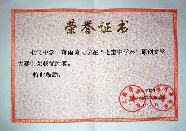 2015.02蒋雨琦----获“七宝中学杯”原创文学大赛优胜奖(证书)