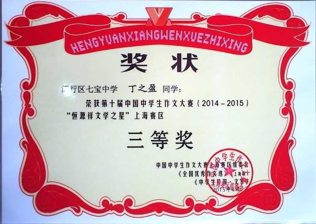 2015.04丁之盈----荣获第10届中国中学生作文大赛(2014-2015) “恒源祥文学之星”上海赛区三等奖(奖状)