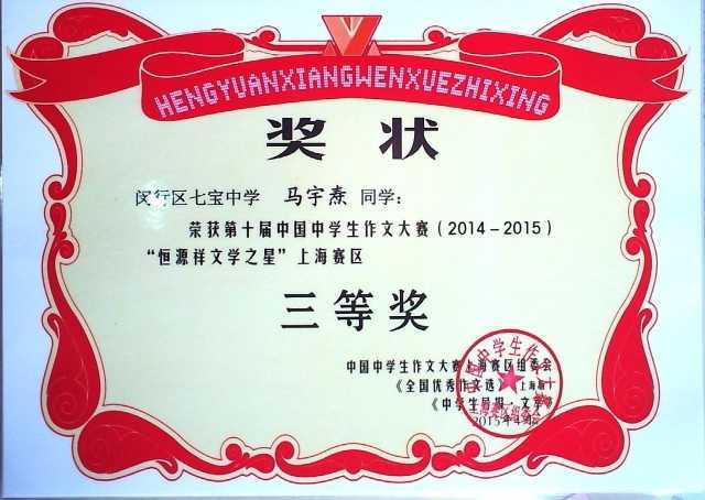2015.04马宇焘----荣获第10届中国中学生作文大赛(2014-2015) “恒源祥文学之星”上海赛区三等奖(奖状)