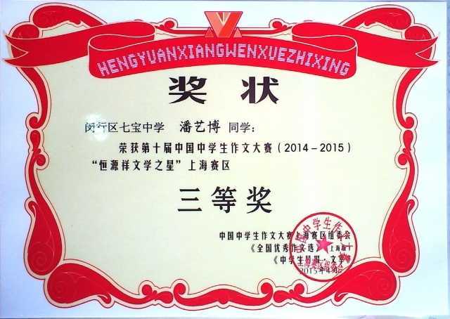 2015.04潘艺博----荣获第10届中国中学生作文大赛(2014-2015) “恒源祥文学之星”上海赛区三等奖(奖状)