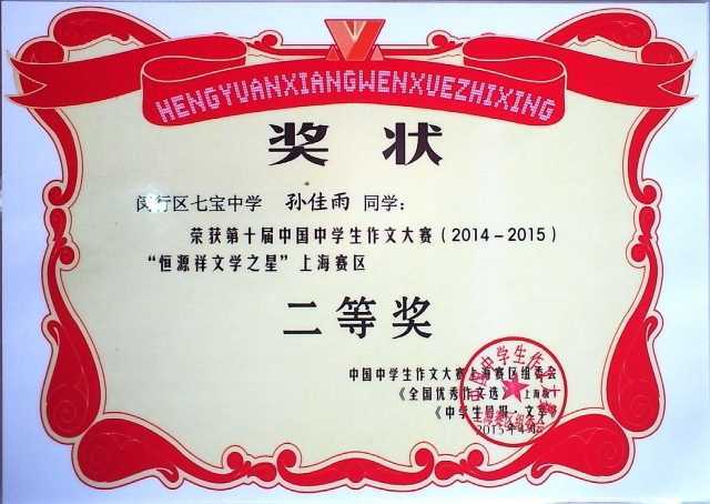 2015.04孙佳雨----荣获第10届中国中学生作文大赛(2014-2015) “恒源祥文学之星”上海赛区二等奖(奖状)