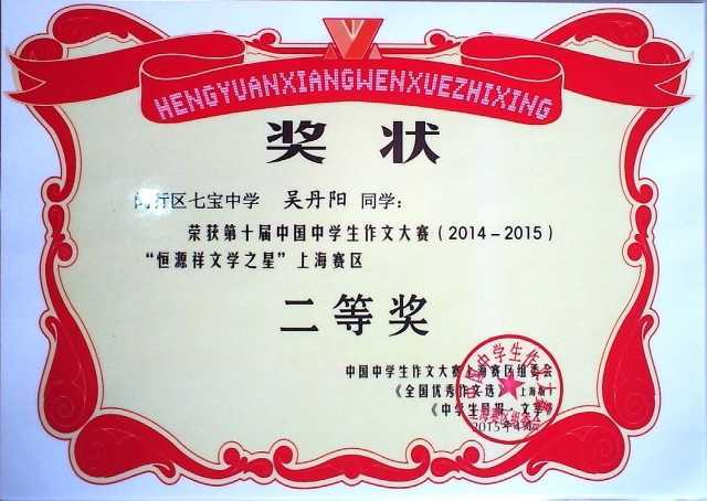 2015.04吴丹阳----荣获第10届中国中学生作文大赛(2014-2015) “恒源祥文学之星”上海赛区二等奖(奖状)