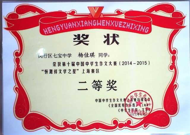 2015.04杨佳琪----荣获第10届中国中学生作文大赛(2014-2015) “恒源祥文学之星”上海赛区二等奖(奖状)