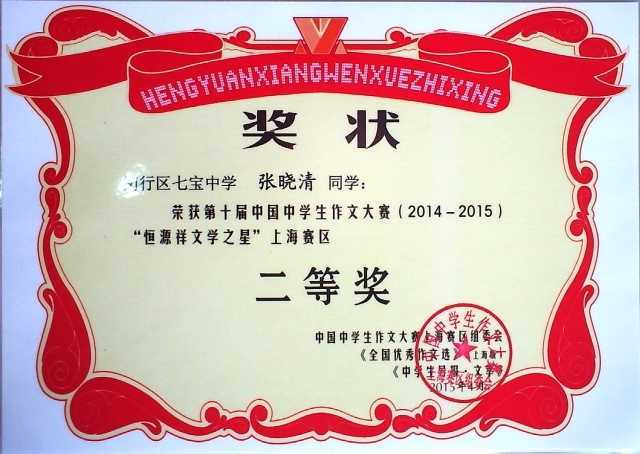 2015.04张晓清----荣获第10届中国中学生作文大赛(2014-2015) “恒源祥文学之星”上海赛区二等奖(奖状)