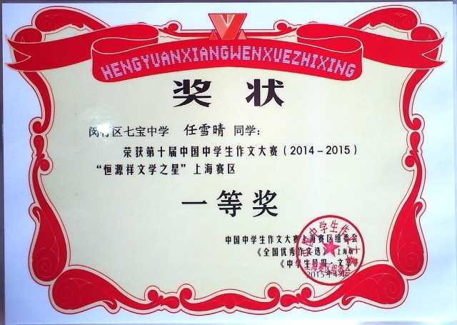 任雪晴----荣获第10届中国中学生作文大赛(2014-2015) “恒源祥文学之星”上海赛区一等奖