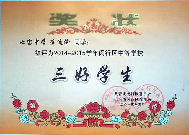 2015.05李逸伦----被评为2014-2015学年闵行区中等学校三好学生(奖状)