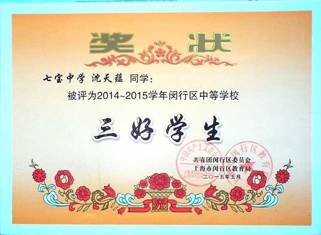 2015.05沈天蕴----被评为2014-2015学年闵行区中等学校三好学生(奖状)