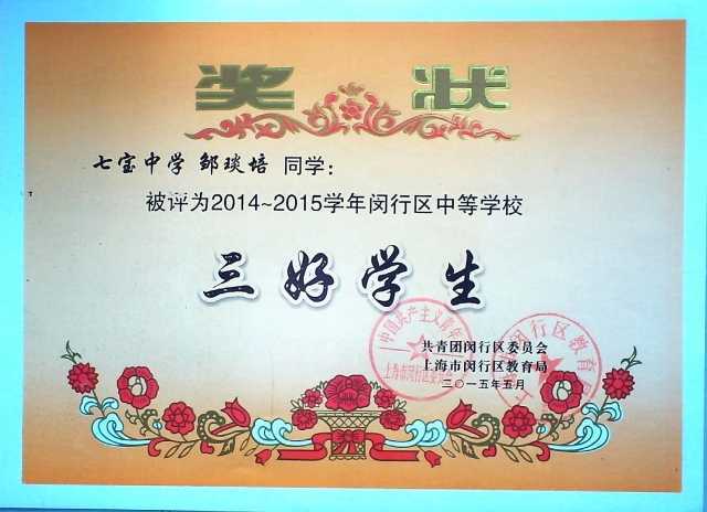 2015.05邹琰培----被评为2014-2015学年闵行区中等学校三好学生(奖状)