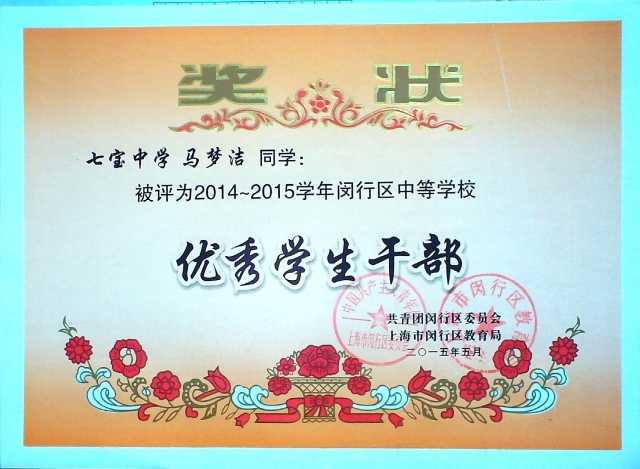 2015.05马梦洁----被评为2014-2015学年闵行区中等学校优秀学生干部(奖状)