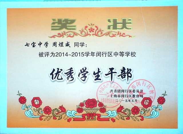 2015.05周煜威----被评为2014-2015学年闵行区中等学校优秀学生干部(奖状)
