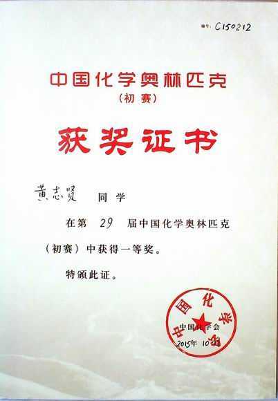 2015.10黄志贤---荣获第29届中国化学奥林匹克(初赛)一等奖(证书)
