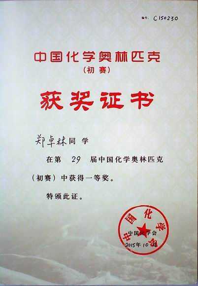 2015.10郑卓林---荣获第29届中国化学奥林匹克(初赛)一等奖(证书)