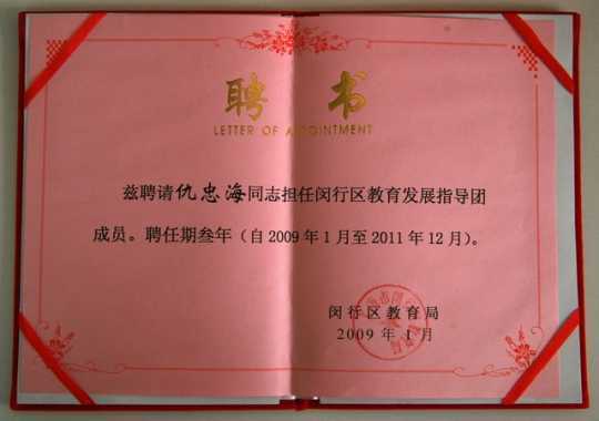仇忠海----被聘为闵行区教育发展指导团成员(自2009年1月至2011年12月)(聘书)