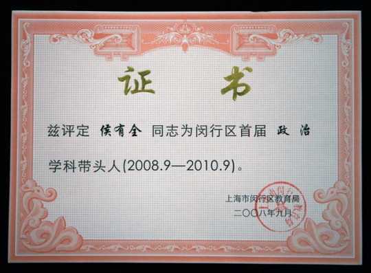 侯友全----获闵行区首届政治学科带头人(2008.9--2010.9)(证书)