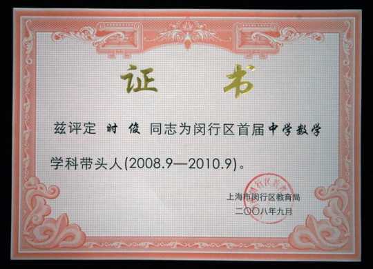 时俊----获闵行区首届中学数学学科带头人(2008.9--2010.9)(证书)