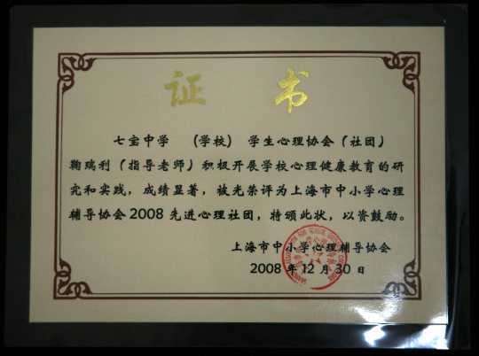 鞠瑞利----指导的学生心理协会评为上海市中小学心理辅导协会2008先进心理社团(证书)