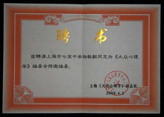 2008.04杨敏毅----聘请《大众心理学》编委会特邀编委(聘书)