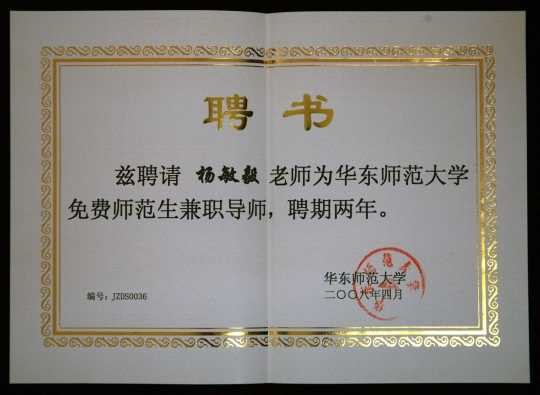 2008.04杨敏毅----聘为华东师范大学免费师范生兼职导师(聘期二年)(聘书)
