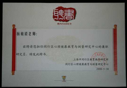 杨敏毅----被聘请担任闵行区心理健康教育与测量研究中心的兼职研究员(聘书)