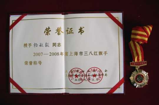 杨敏毅--获2007--2008年度上海市三八红旗手荣誉称号(证书)
