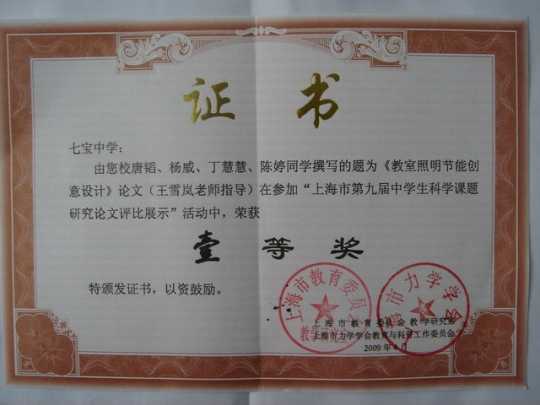 2009.04王雪岚--指导学生撰写的论文《教室照明节能创意设计》获上海市第九届中学生科学课题研究论文评比一等奖(证书)