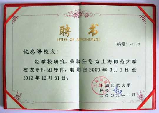 仇忠海----聘为上海师范大学校友导师团导师(聘期自2009年3月日至2012年12月31日)(聘书
