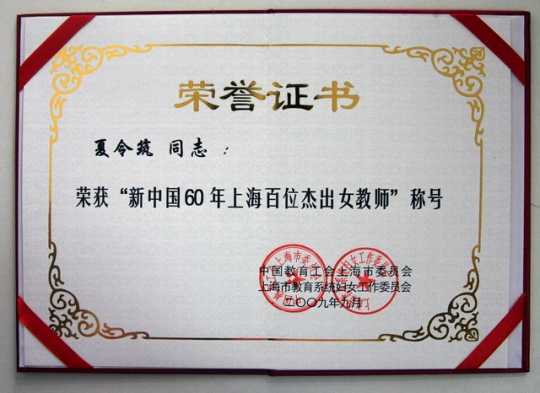 2009.09夏令筑--获新中国60年上海百位杰出女教师称号(证书)