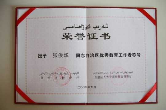 2009.09张俊华----被授予自治区优秀教育工作者称号(证书)
