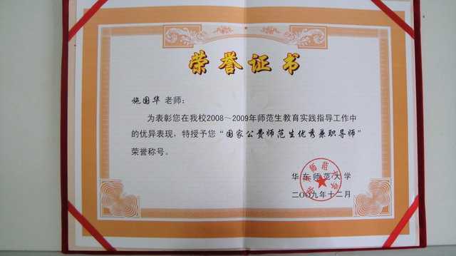 2009.12施国华----在华东师范大学2008-2009师范生教育实践指导工作中,被授予国家公费师范生优秀兼职导师荣誉称号(证书)