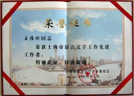王维刚----获上海市语言文字工作先进工作者(证书)