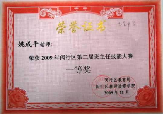 姚成平----获2009年闵行区第二届班主任技能大赛一等奖(证书)
