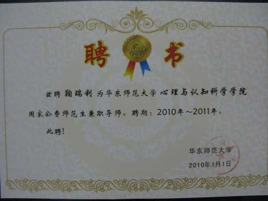 鞠瑞利----被聘为华东师大公费师范生兼职导师(聘期2010-2011年)(聘书)