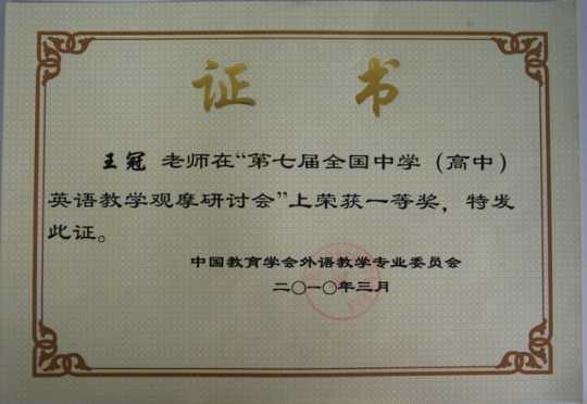 2010.03王冠----获第七届全国中学(高中)英语教学观摩研讨会一等奖(证书)