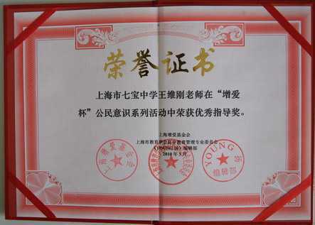 王维刚----获增爱杯公民意识系列活动优秀指导奖(证书)