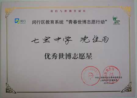 沈佳雨----评为闵行区教育系统“青春世博志愿行动”优秀世博志愿星(证书)