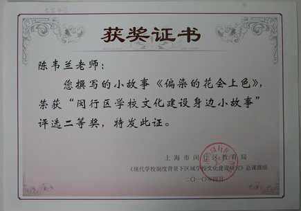 2010.04陈韦兰----撰写的《偏染的花会上色》荣获闵行区学校文化建设身边小故事评选二等奖(证书).jpg