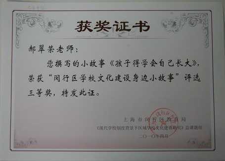 2010.04郝翠荣----撰写的《孩子得学会自己长大》荣获闵行区学校文化建设身边小故事评选三等奖(证书).jpg