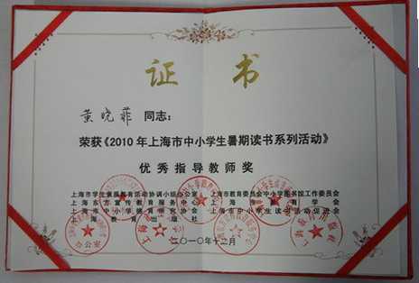 黄晓菲---获《2010年上海市中小学生暑期读书系列活动》优秀指导教师奖(证书)