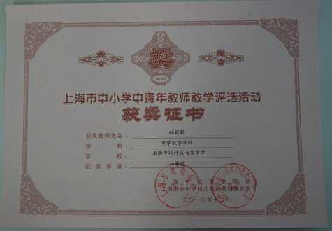 2010.12郝莉莉----获上海市中小学中青年教师教学评选活动(中学数学学科)一等奖.jpg