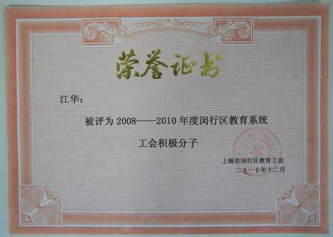 江华----评为2008--2010年度闵行区教育系统工会积极分子(证书)