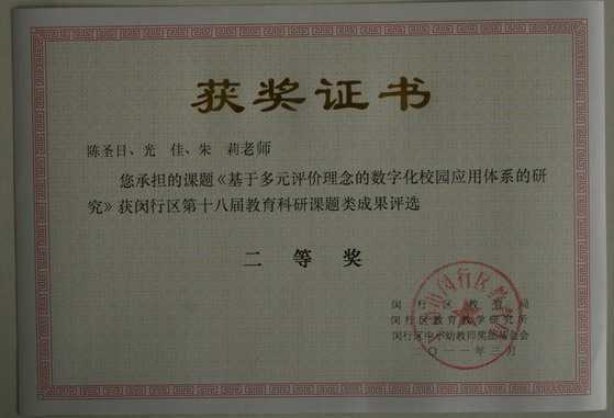 2011.03陈圣日、光佳、朱莉----承担的课题《基于多元评价理念的数字化校园应用体系的研究》获闵行区第十八届教育科研课题类成果二等奖(证书).jpg