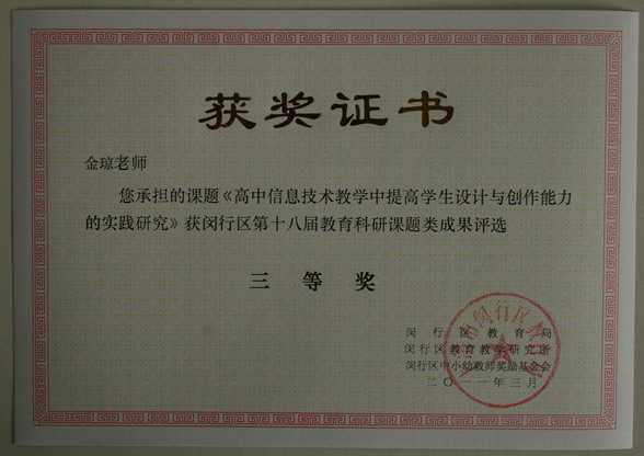 2011.03金琼----承担的课题《高中信息技术教学中提高学生设计与创作能力的实践研究》获闵行区第十八届教育科研课题类成果评选三等奖(证书).jpg