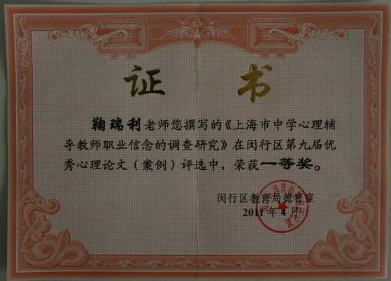 2011.04鞠瑞利----撰写的《上海市中学心理辅导教育职业信念的调查研究》获闵行区第九届优秀心理论文(案例)评选一等奖(证书).jpg